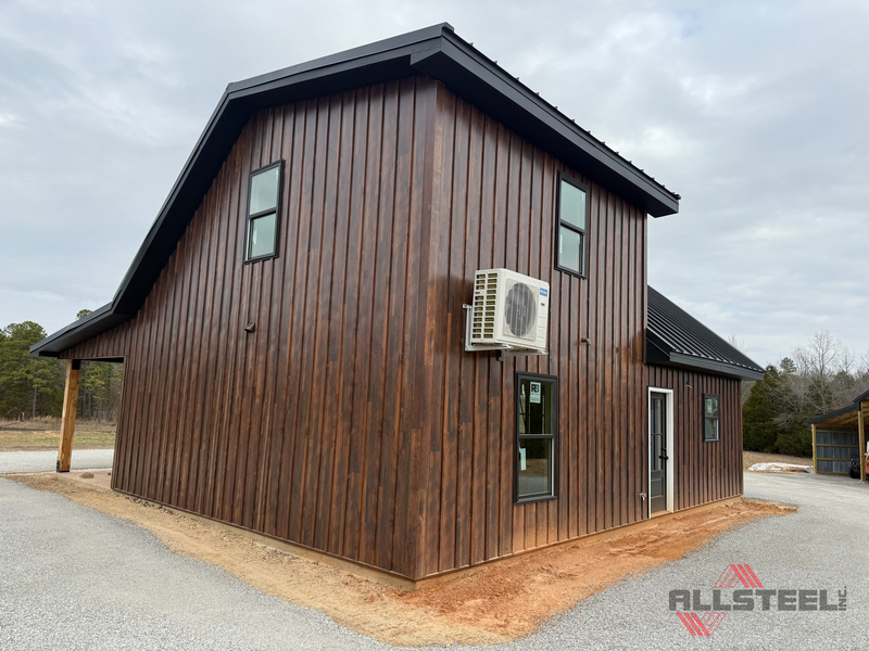Traditional board and batten siding is a distinctive exterior cladding style characterized by wide vertical boards with narrow strips of wood (battens) covering the seams, creating a unique aesthetic that is often rustic or modern farmhouse-inspired. With the introduction of metal board and batten panels, the possibilities have expanded exponentially, catering to residential, agricultural, and commercial applications. Metal board and batten panels boast a 2” batten that securely locks into the nailing slots on the adjacent panel end, replicating the traditional wood siding while leveraging the advantages of 26-gauge steel. The versatility of metal board and batten enables its use on entire structures, including homes, shops, garages, barns, and commercial buildings, as well as accent elements. As barndominiums continue to gain popularity, metal board and batten is becoming increasingly sought after, available in a range of colors, including our standard colors, crinkle finish, or our most popular Tru-Steel HD® woodgrain finish. Metal board and batten can be paired with our metal lap siding or any other panel to create visually appeal contrast.